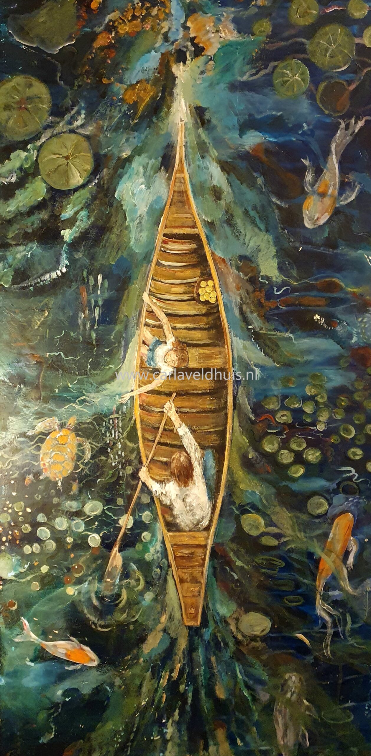 Dit beeld vertelt van psalm 139,4; van op reis zijn, met Jezus in een boot die ons tempo bepaald, wij zien waar heen Hij ons mee neemt, een geestelijke reis. Dingen die achter ons liggen, en achter ons mogen laten, en dingen waar we naar toe gaan, die nog gaan komen, die Hij van plan is in ons leven. Het is genieten, kijken wat Hij aan het doen is. Er is een ongekende schoonheid die Hij door dit proces ons onderweg wil tonen. Zo mooi is Hij. (Geen New Age maar Jezus).