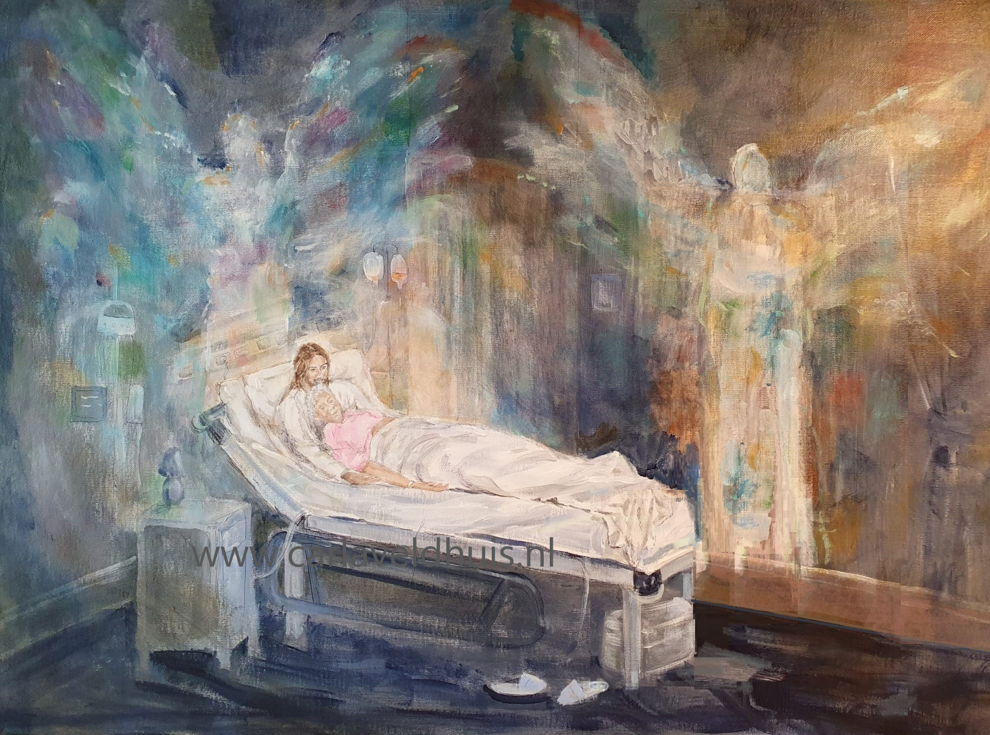 Ik zag nl. Jezus bij haar IN het ziektebed zitten. Hij was er min of als “haar kussen”. Hij was zachtjes aan het neuriën in haar haar, zodat ze kon slapen. Ze dommelde wat en leunde tegen Hem aan. Jezus zat er geduldig om haar te helpen rusten en zo de tijd doorkomen. Ik zag een glorie van God in de ziekenkamer. Engelen waren daar en ook een hele mooie kleurige vrede, het bed was een plek van Licht-door-Jezus. Hij hielp haar door de moeilijke tijd van wachten heen. Wachten op het einde, zonder angst.